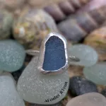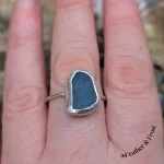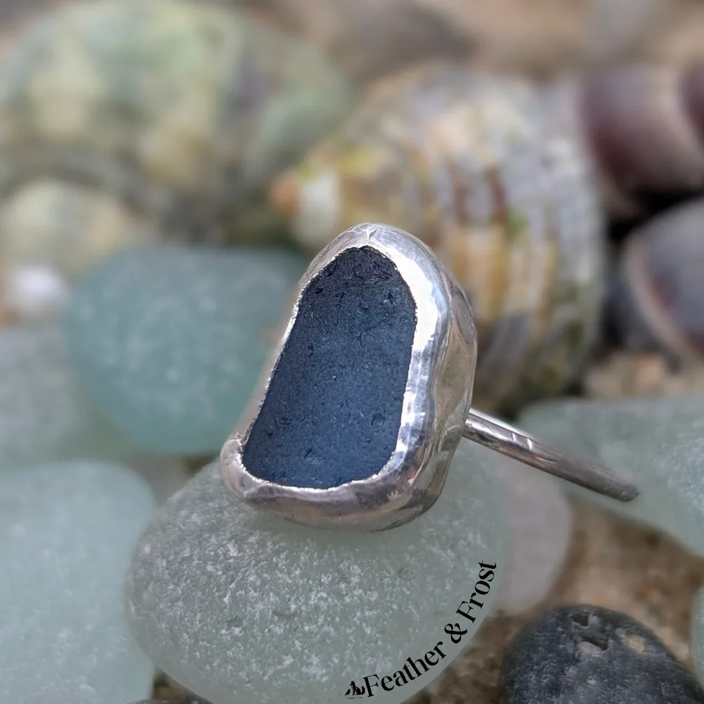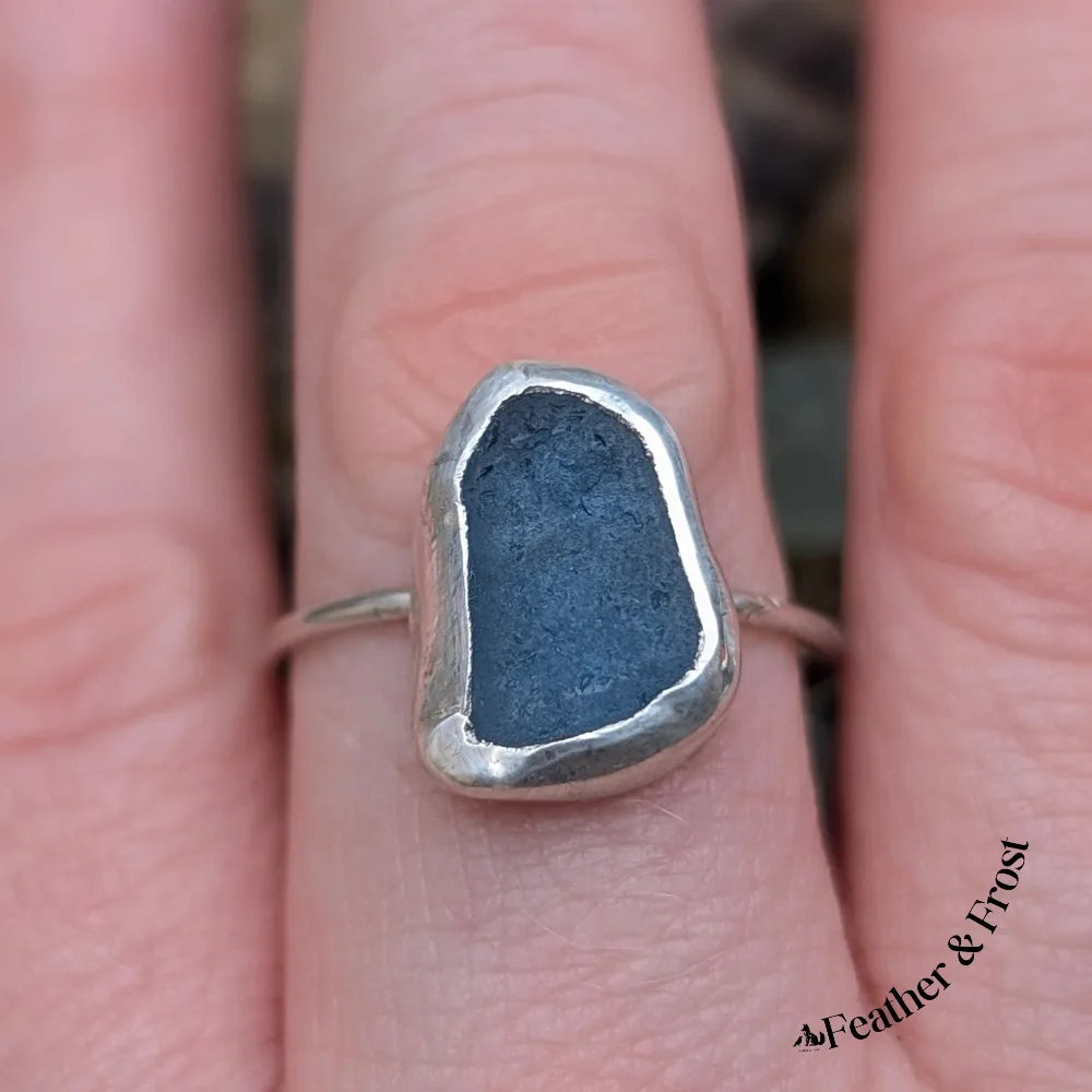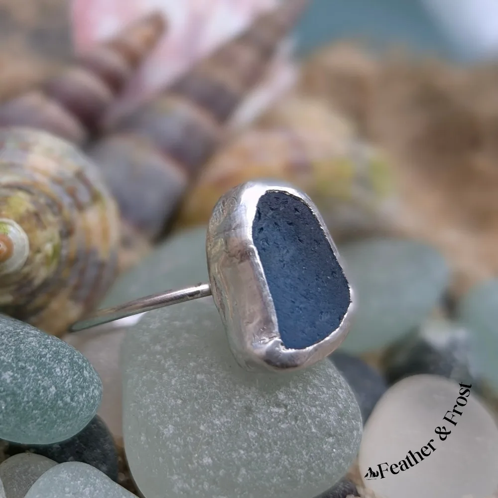 Blue sea glass is a favourite among collectors, its cool tones a constant reminder of open water. This piece was hand-foraged from the Solway Firth, the dramatic estuary on the Scottish-English border where the tidal range runs vast and the shore gives up sea glass in beautiful condition. It has been set by hand into a polished recycled sterling silver bezel band, 1.2mm wide — a simple, understated setting designed to let the glass speak for itself.